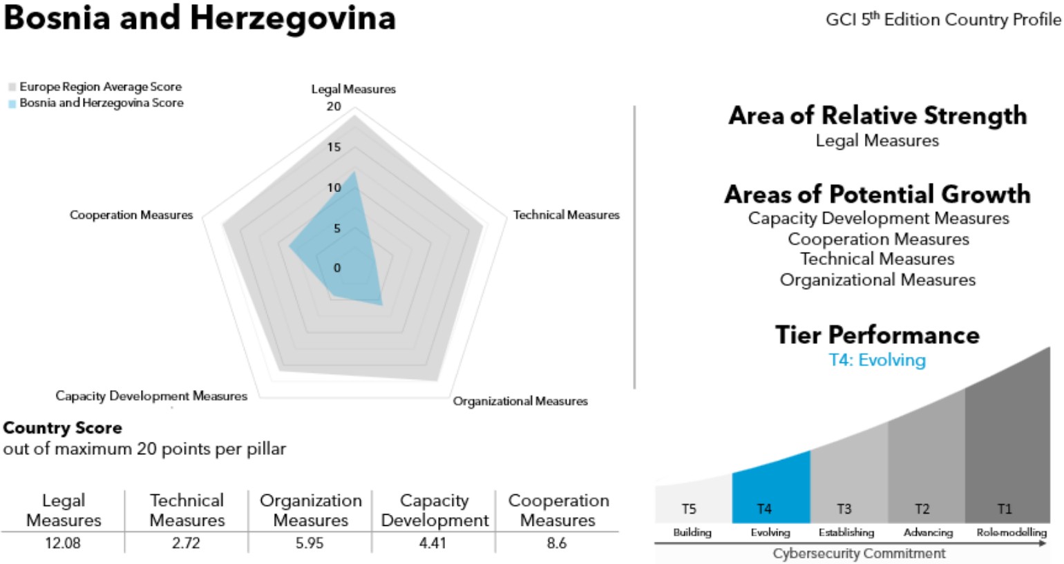 Bosnia and Herzegovina demonstrates 33.33% and 33.76% completion rates of eGA’s NCSI and ITU’s 2024 GCI, respectively. This NCSI score lags quite behind the average of the EGDI and NRI digital development metrics, thus indicating that cybersecurity is not being considered at the national level in the digital transformation process.