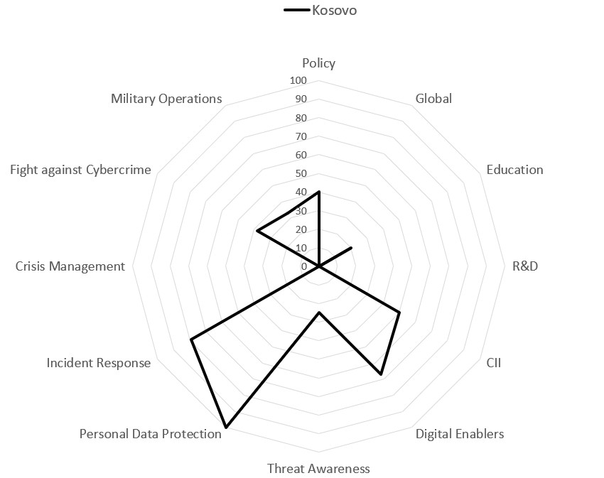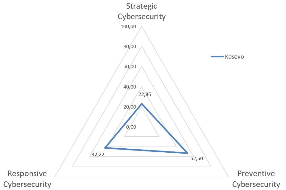 Kosovo demonstrates a higher level of preventive cybersecurity, followed by a decreasing emphasis on responsive and strategic cybersecurity. Due to its heterogeneous international recognition, Kosovo does not figure in the ITU’s GCI or the EGDI and NRI digital development metrics.